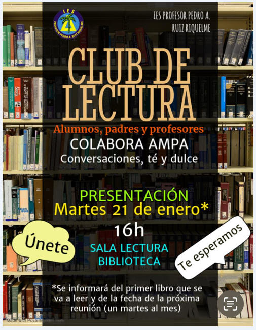 Ven al CLUB DE LECTURA, que reinicia su actividad el próximo 21 de Enero, a las 16h., en la biblioteca del instituto.