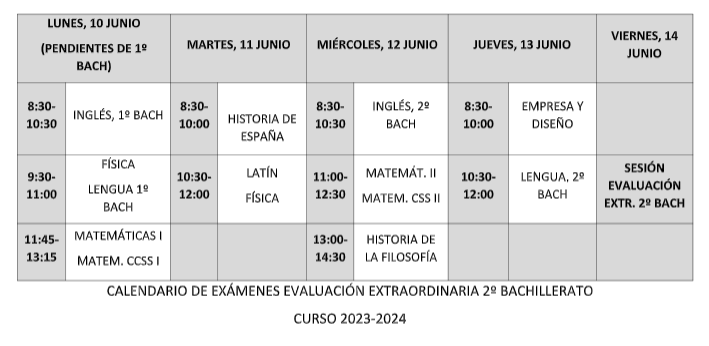 Calendario de exámenes extraordinarios de 2º de bachillerato