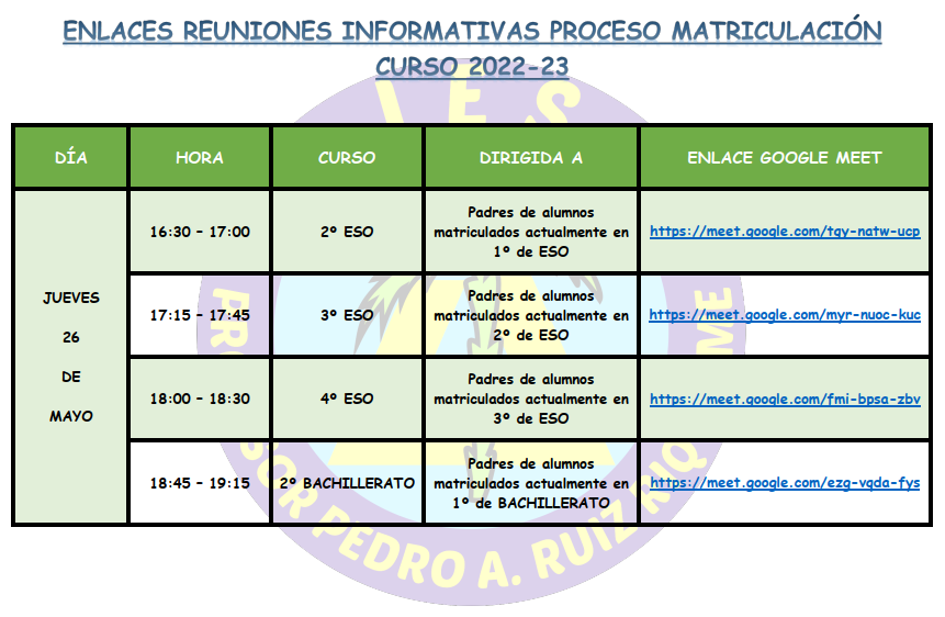 Inicio Pruebas de acceso de grado medio y grado superior 2025 Haz click en la imagen para acceder a la información ENLACE A REUNIONES INFORMATIVAS PROCESO DE MATRICULACIÓN 2022-23