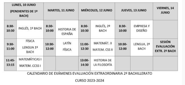 Calendario de exámenes extraordinarios de 2º de bachillerato