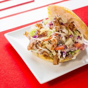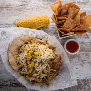 Ensalada, carne, queso gouda, maíz, salsa gaucha
