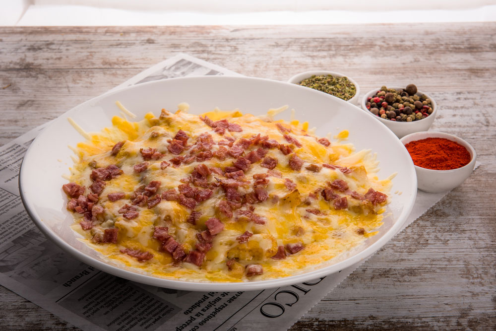 Bacon crujiente, quesos gouda, cheddar y manchego fundidos, salsa trifásica