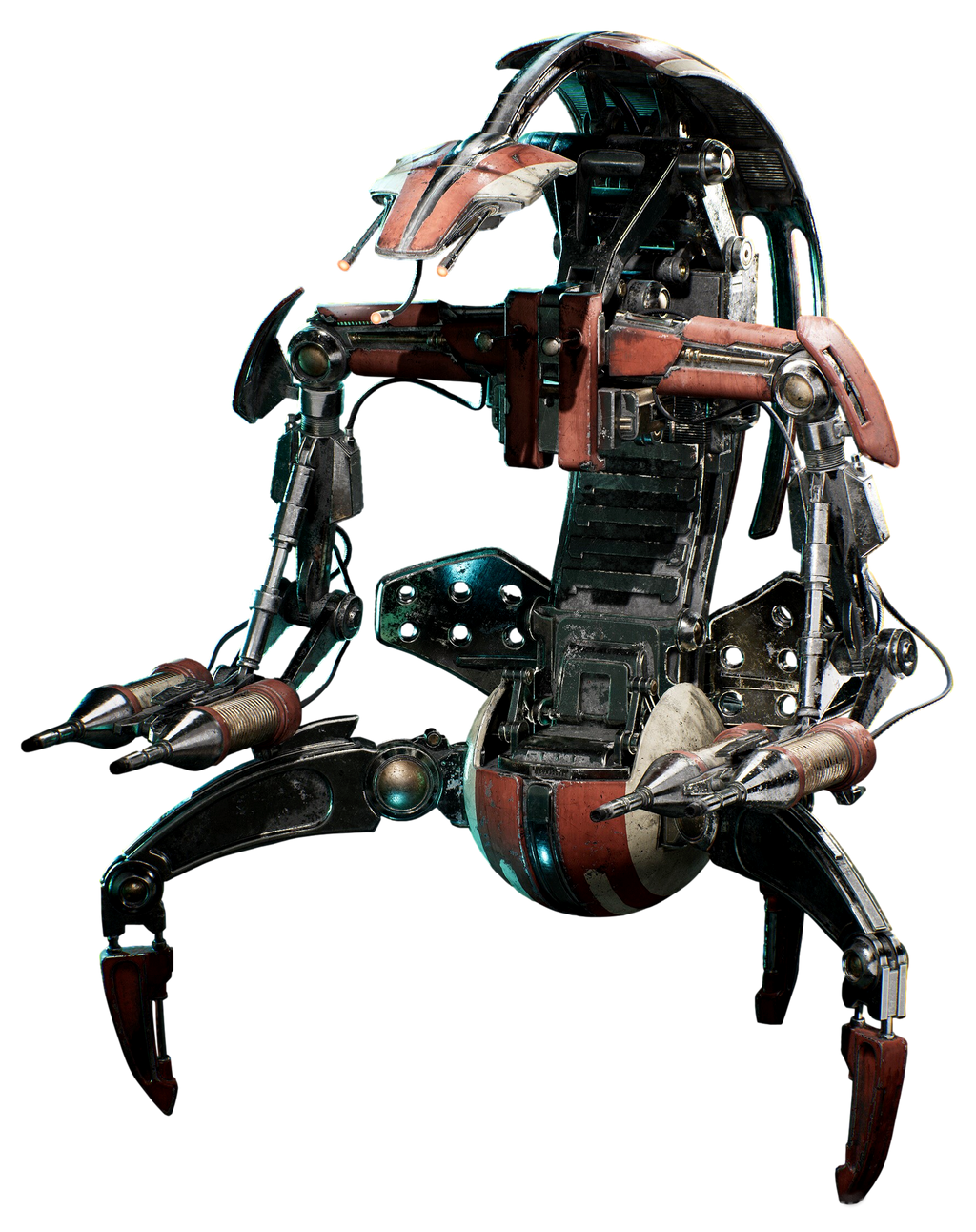 - Silencioso y sin voz: A diferencia de otros droides, los droidekas no hablan. Emiten sonidos mecánicos y un zumbido característico al activar su escudo o transformarse.