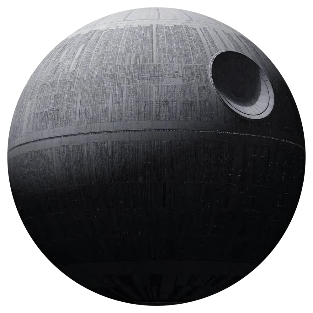 🔹 Forma: Es una enorme esfera metálica, casi perfecta, con una gran depresión en la superficie donde se encuentra su arma principal: el superláser.